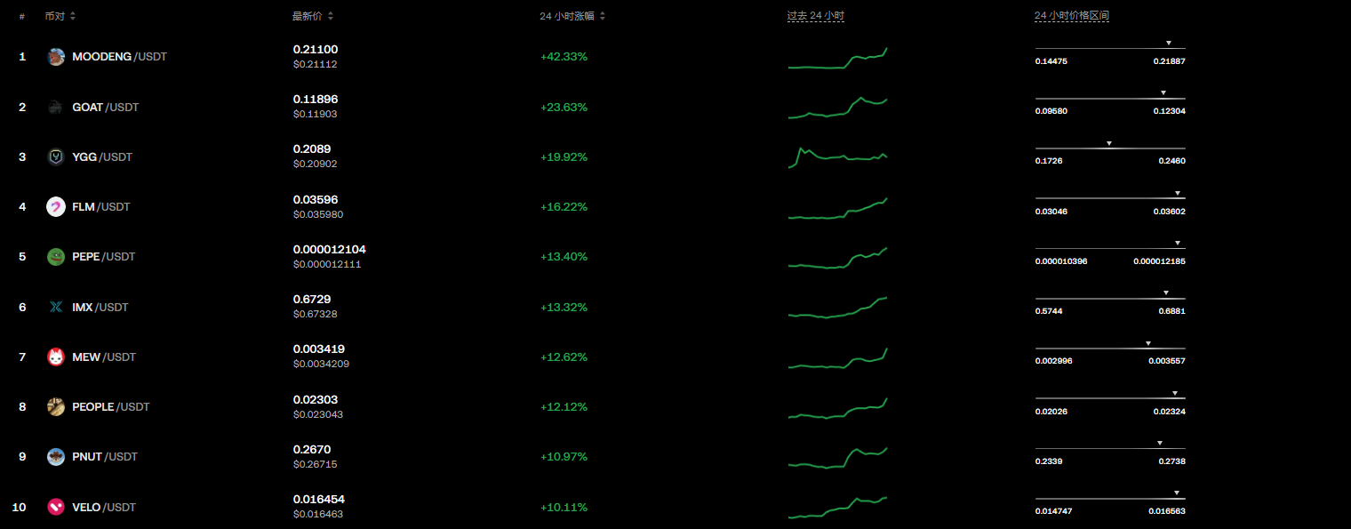 值得注意的是,昨夜啟動的這波漲勢中,迷因幣整體回溫,在上架較多迷因幣現貨的 OKX 上,漲幅榜幾乎被迷因幣霸榜,其中以 Solana 迷因幣 MOODENG(河馬)漲勢最強,近 24 小時漲幅高達 42%。