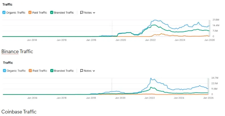 從 Binance、Coinbase 等幾家頭部 CEX 的站點流量可以看到:自 2021 年牛市峰值以來,整體訪問量持續下行,即便 BTC 創出新高也未顯著恢復。與隔壁 Robinhood 的火爆形成鮮明對比。更多可以閱讀我們去年寫的「Where are the marginal buyers」