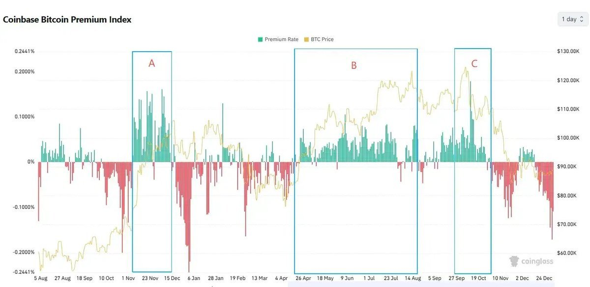 Coinbase Premium 在 A/B/C 三個衝頂階段均維持正溢價,說明高位買盤主要來自以 Coinbase 為代表的 onshore 現貨資金。