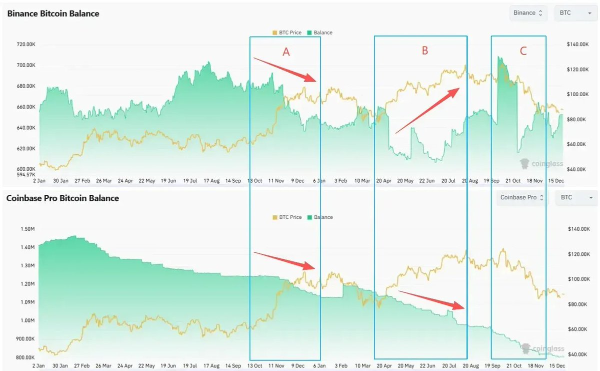 Coinbase BTC Balance 週期內持續下行,CEX 側的可售籌碼減少。與之對照,Binance Balance 在 B、C 兩個階段隨價格反彈而顯著上升,對應 offshore 現貨的潛在拋壓增加。