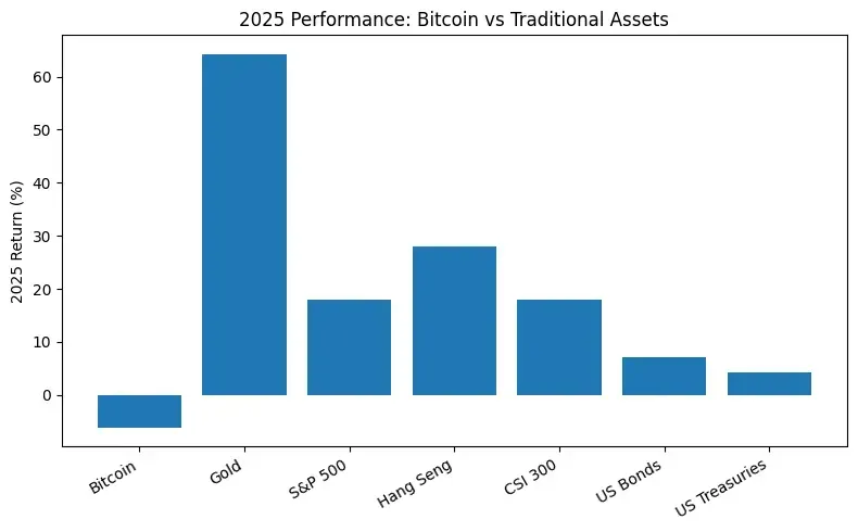 跨資產層面,即便在政策友好和制度紅利釋放的背景下,BTC 在 2025 年明顯跑輸黃金、美股、港股、A 股等主要 TradFi 資產,是少數未能跟隨全球風險資產創出同步新高的資產之一。