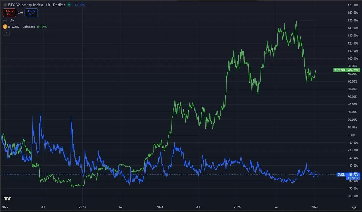 2025 年 8 月,比特幣價格首次突破 12 萬美元時,DVOL 接近局部低點。期權市場並未對持續風險給予足夠的補償。