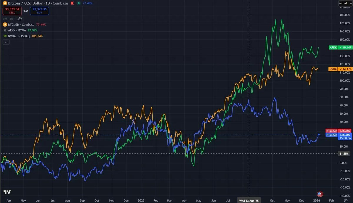 在 BTC 與美股科技股走勢愈發同頻的當下,在 2025 年 8 月卻出現了明顯斷層:BTC 在跟隨 ARKK 和 NVDA 達到 8 月 Top 後,隨即掉隊並迎來 1011 crash,至今未恢復。