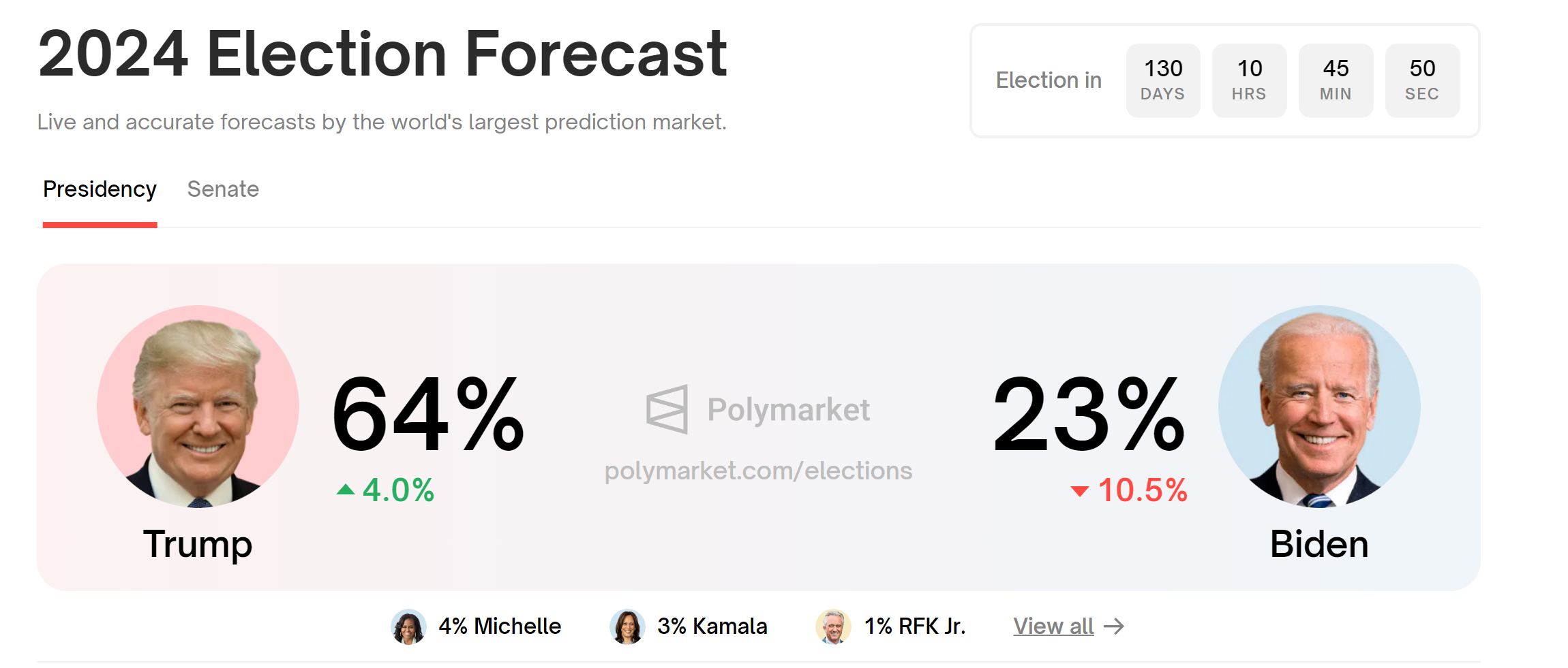 而根據 Polymarket 2024 年美國總統大選預測頁面提供的即時預測顯示,川普的勝率升至 64%,拜登降為 23%。