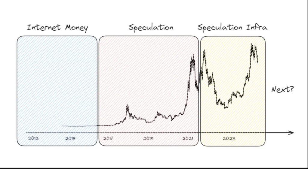 在整個牛市周期中,行業在尋找 PMF 的努力似乎有所倒退。盡管人才和資本的湧入帶來了監管、技術和基礎設施方面的顯著進步,但仍然沒有廣泛 PMF 的區塊鏈産品。即使比特幣和以太坊 ETF 獲得批準,自 2021 年牛市以來,關於去中心化和元宇宙等願景的討論已減少,市場似乎瞄準了越來越小衆的細分市場。