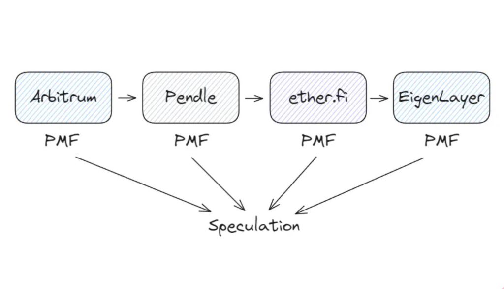 最近,包括 Vitalik Buterin 在內的許多人在社交媒體上提出了類似的觀點。即使是那些看似找到了 PMF 的協議,主要是基礎設施協議,它們的 PMF 通常也來自於投機。