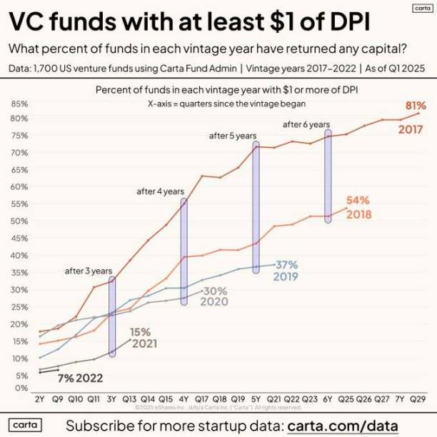 話說在前:融資環境艱難,因為上游 DPI(深潮注:按市值加權的指數,用於追蹤去中心化金融 (DeFi) 資產在加密貨幣市場中的表現)和 LP 的資金挑戰,縱觀整個 VC 領域,基金在相同時間段內向 LP 返還的資金與以往相比有所減少。