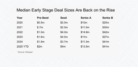 Pre-seed 融資規模持續同比增長,表明市場在早期階段仍擁有充足的資金。種子輪、A 輪和 B 輪融資中位數已接近或回升至 2022 年的水平。
