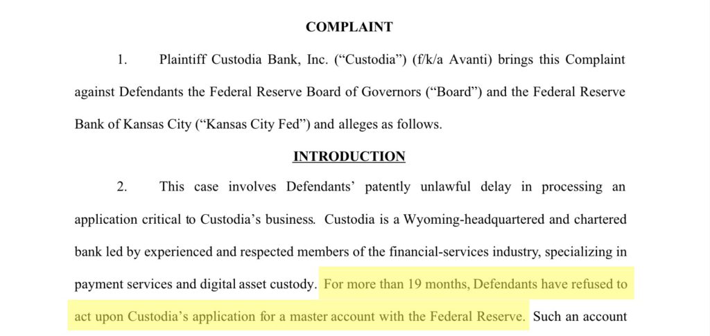 根據訴訟書,堪薩斯城聯儲早在 2020 年 5 就月收到了 Custodia 的商業計劃書、並確認該公司於 2020 年 10 月下旬提交的主帳戶申請已經完成。堪薩斯城聯儲的一名代表還於 2021 年初告知 Custodia 該申請書「沒有任何阻礙」,但至今卻遲遲未能通過。