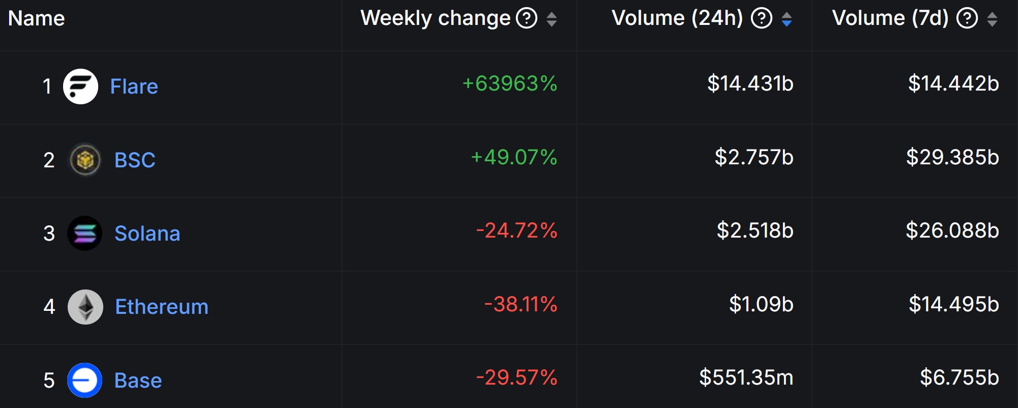 緊接著趙長鵬上周曝光愛犬名字 Broccoli ,更導致成百上千個名為 Broccoli 的迷因幣湧現,進一步吸引市場資金湧入 BNB Chain ,受益於趙長鵬的喊單效應,Defillama 數據顯示,BNB Chain 上交易量在過去一周逼近 300 億美元,周增幅高達 49.07%,交易量在各大主要公鏈高居榜首。