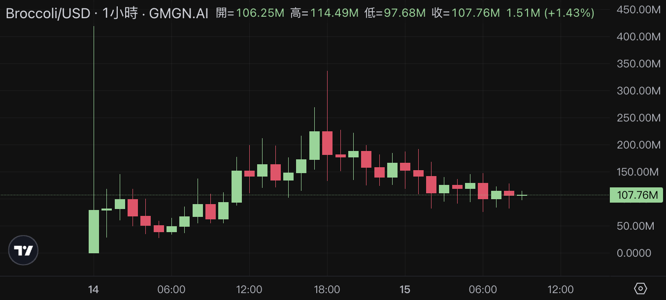 在這一貼文發布後,成交量最高的 Brocooli 市值在 1 小時內從高點 3.36 億美元暴跌至 1.32 億美元,跌幅達 60%。隨後價格持續震盪下行,截稿前報 1.08 億美元,幾乎回吐近 24 小時的漲幅,僅上漲 11.38%。