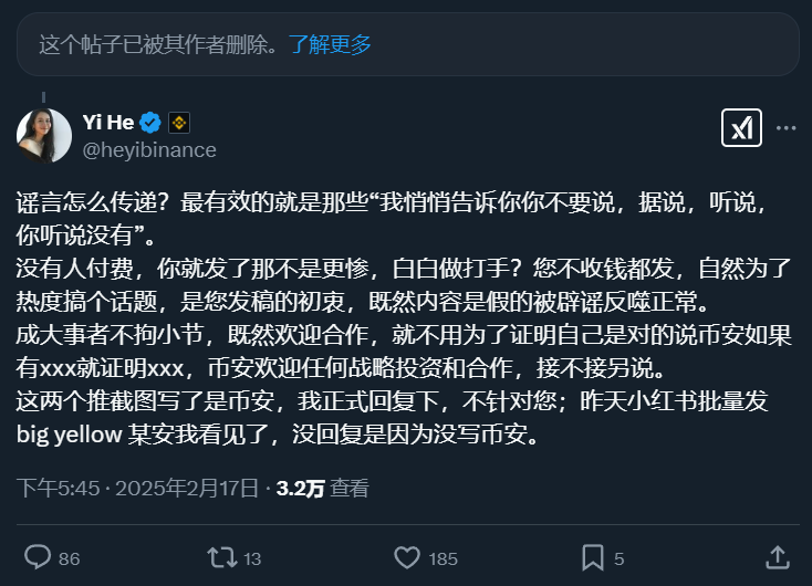 針對社群中多個網友發表的有關幣安出售的言論,幣安共同創辦人何一也統一在 X 平台回復表示,稱非常多的人都沒有證據證明幣安被出售,就在社交平台上傳播謠言,這是做了別人的打手: