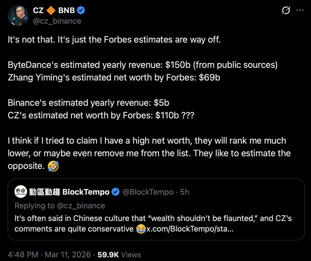 繼否認富比士對其身家的估算後,CZ 進一步提出具體的數字反駁,直接拿幣安與字節跳動做比較,指富比士的估算「根本差很多」,並幽默回應動區在 X 上的留言,稱若他主動聲稱身家很高,Forbes 反而會把排名調低。