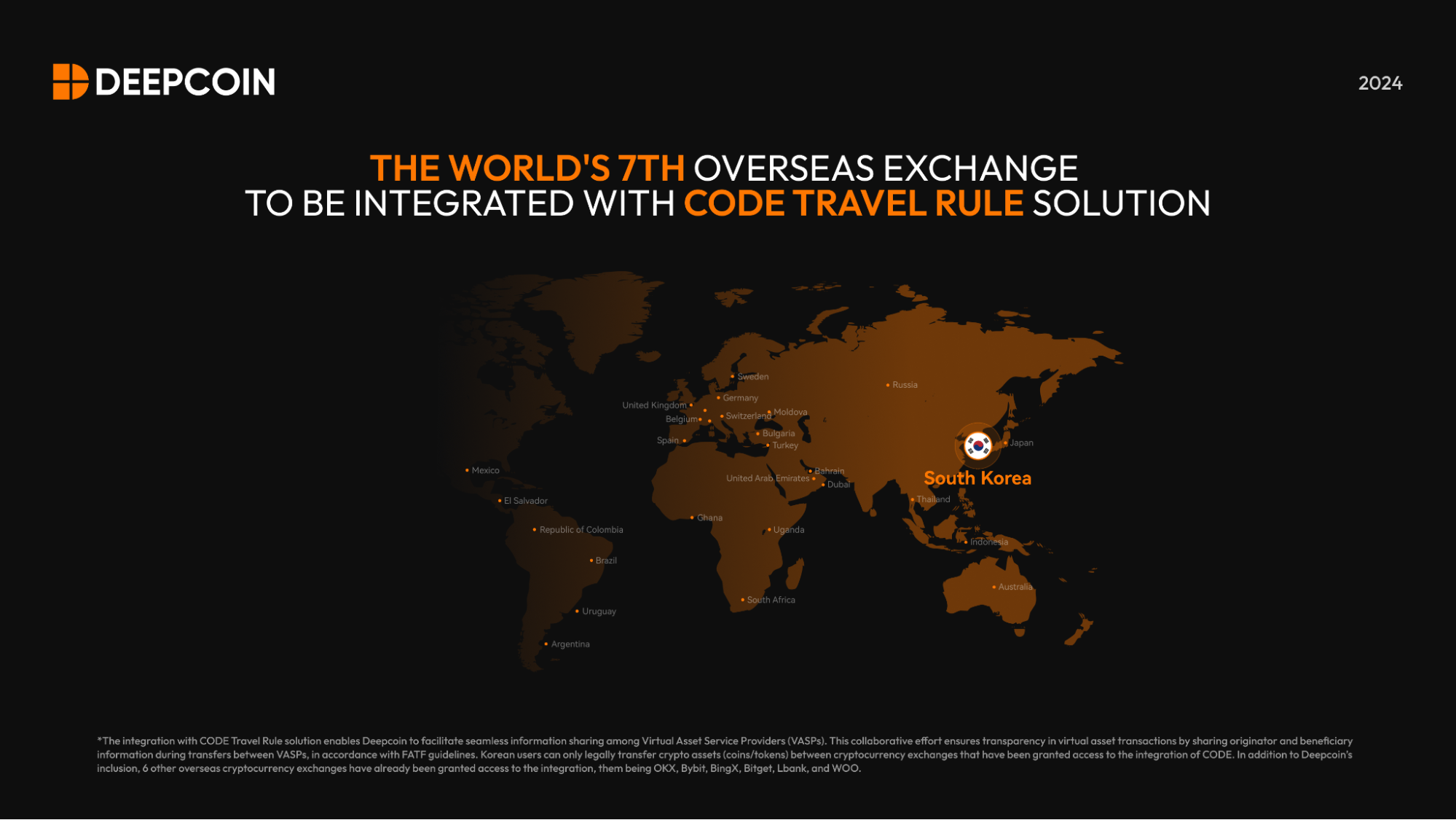 2024 年 1 月,Deepcoin 成為全年首家、全球第七家接入韓國 CODE 合規解決方案以遵守韓國 Travel Rule 法規的海外加密貨幣交易所。目前,Deepcoin 已完成與 CODE 的整合,凸顯了 Deepcoin 對提高加密領域合規標準及強化其安全基礎設施的長期承諾。
