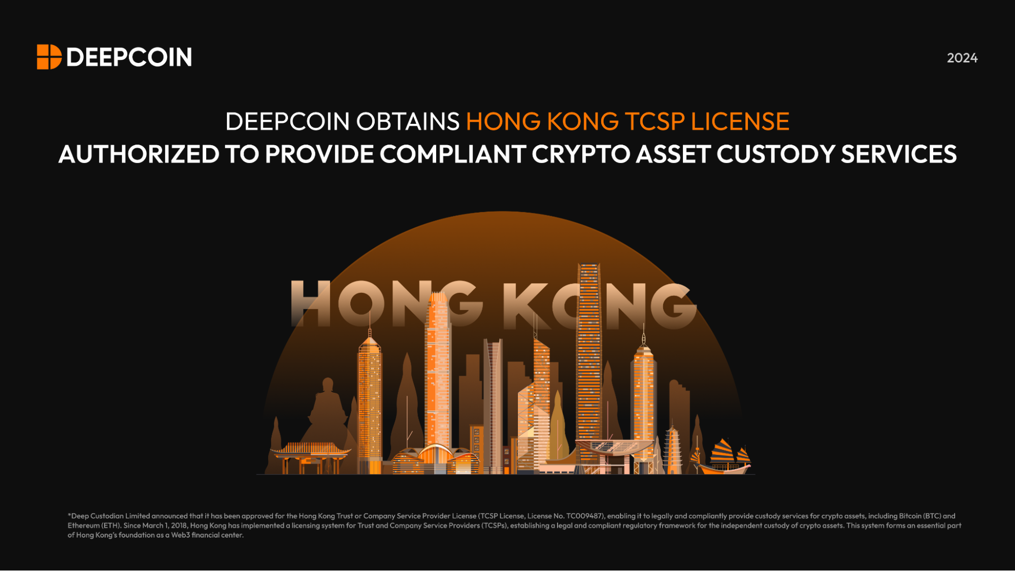 2024年7月,Deep Custodian Limited 獲批香港「信託或公司服務提供者牌照(Trust or Company Service Provider License,持牌編號TC009487)」,可依法合規為客戶提供包括比特幣、以太坊等加密資產託管服務。Deep Custodian Limited 透過最先進的安全技術,為個人及機構客戶提供安全合規的資產託管服務,確保每一筆交易都能在安全可靠的環境中進行。