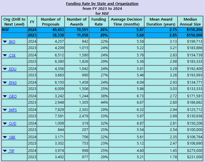 根據 NSF(美國國家科學基金會) 的資料,2023 年和 2024 年的科研資助通過率分別為 29% 和 26%,而單個專案的年度中位撥款金額僅為 15 萬美元,相對有限。NIH(美國國立衛生研究院) 的資助成功率通常在 15% 至 30% 之間。由於單筆撥款往往難以滿足許多研究人員的需求,他們不得不反覆申請多個專案以維持研究運作。