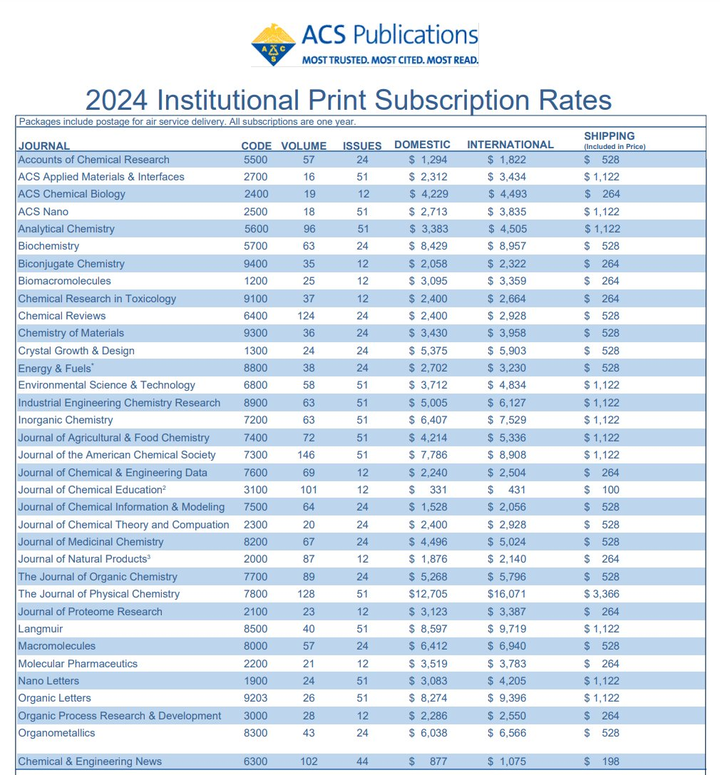 學術期刊的訂閱費用同樣高得驚人。 雖然機構訂閱費會根據期刊的研究領域和型別有所不同,但美國化學學會(ACS) 旗下期刊的單本平均年費高達 4,908 美元。如果一所機構訂閱 ACS 旗下所有期刊,年費用將高達 17 萬美元。