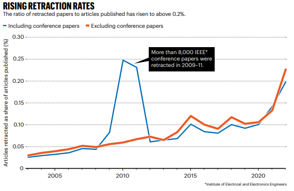 一些研究人員甚至會操縱資料或誇大研究結論。當前的科研資助機制要求研究人員在極短時間內交出成果,這無形中助長了學術不端行為。作為研究生時,我經常聽說其他實驗室的學生偽造資料的案例。《Nature》曾報導,學術會議和期刊論文的撤稿比例近年來急劇上升,反應出這一問題的嚴重性。