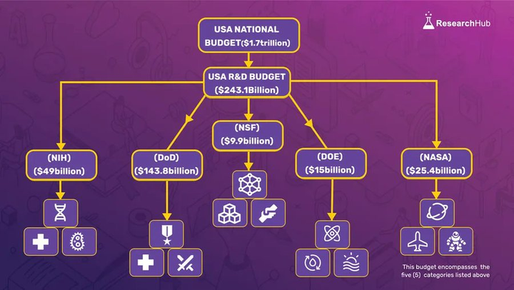在美國,科研經費的分配流程由聯邦政府從預算中撥出一部分資金用於 R&D(研究與開發),再分配給不同的機構。其中,主要的科研資助機構包括: