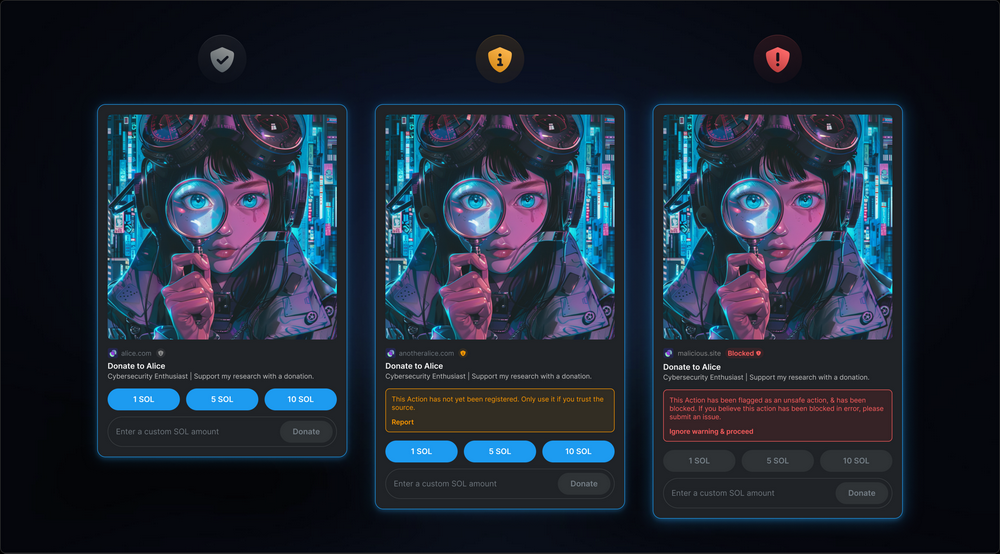 簡單理解的話,由開發人員透過 Actions 協議將希望分享的鏈上操作建立為一個連結,而使用者端能夠互動的這個頁面功能被稱為 Blinks。