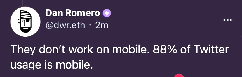 此外,Farcaster 的創辦人 Dan Romero 在評論時表示,「它們不能在手機上工作。88% 的 Twitter 使用是移動的」,對此有網友反駁 Dan Romero,Solana 生態還有自己的 Web3 手機。