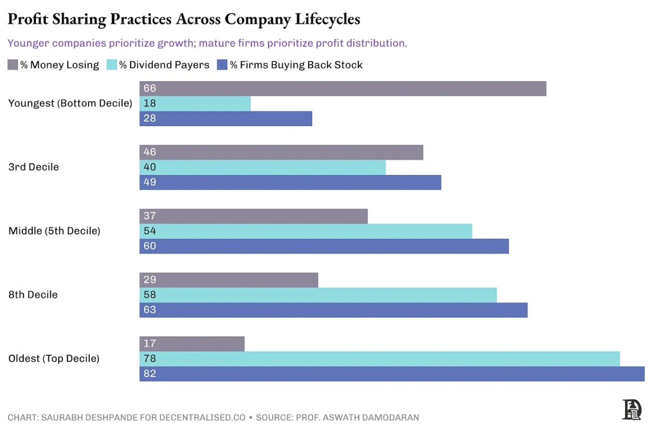 該圖表展示了傳統公司隨著成熟度的提升,利潤分享行為是如何演變的。年輕公司面臨高額財務虧損(66%),因此傾向於留存利潤用於再投資,而非分配股息(18%)或進行股票回購(28%)。隨著公司走向成熟,盈利能力通常趨於穩定,股息支付和回購也相應增加。成熟公司經常分配利潤,股息(78%)和回購(82%)變得普遍。