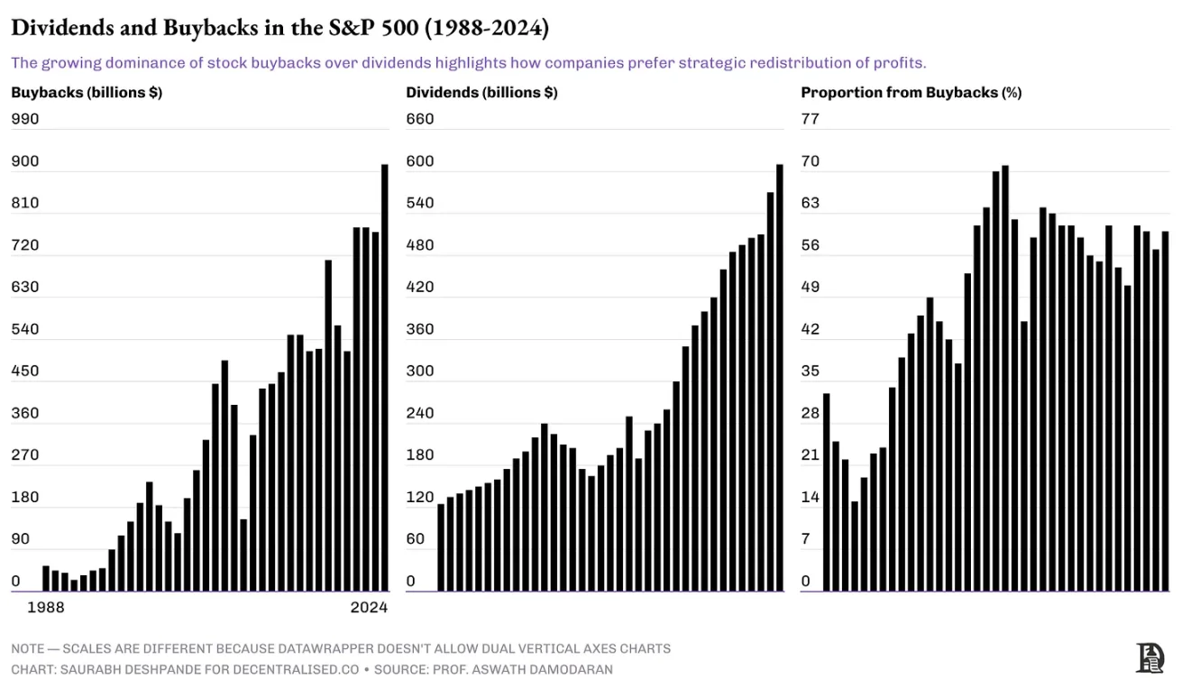 20 世紀 90 年代初,只有約 20% 的利潤通過回購分配。到了 2024 年,約 60% 的利潤分配是通過回購進行分配的。按美元計算,回購在 1999 年超過股息派發,此後一直保持領先。