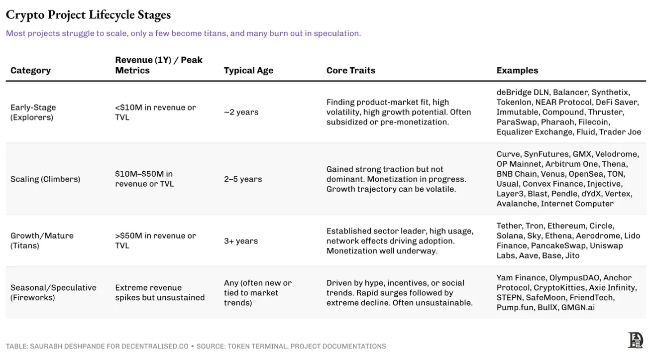 網路效應形成了競爭護城河,使其難以被取代。目前,只有幾十個專案能達到這一營收水平,這意味著極少有協議真正達到成熟。與早期或成長階段的專案不同,這些協議不依賴通膨性的代幣激勵,而是通過交易手續費、借貸利息或質押佣金賺取可持續收入。它們抵禦市場週期的能力進一步將其與投機專案區分開來。