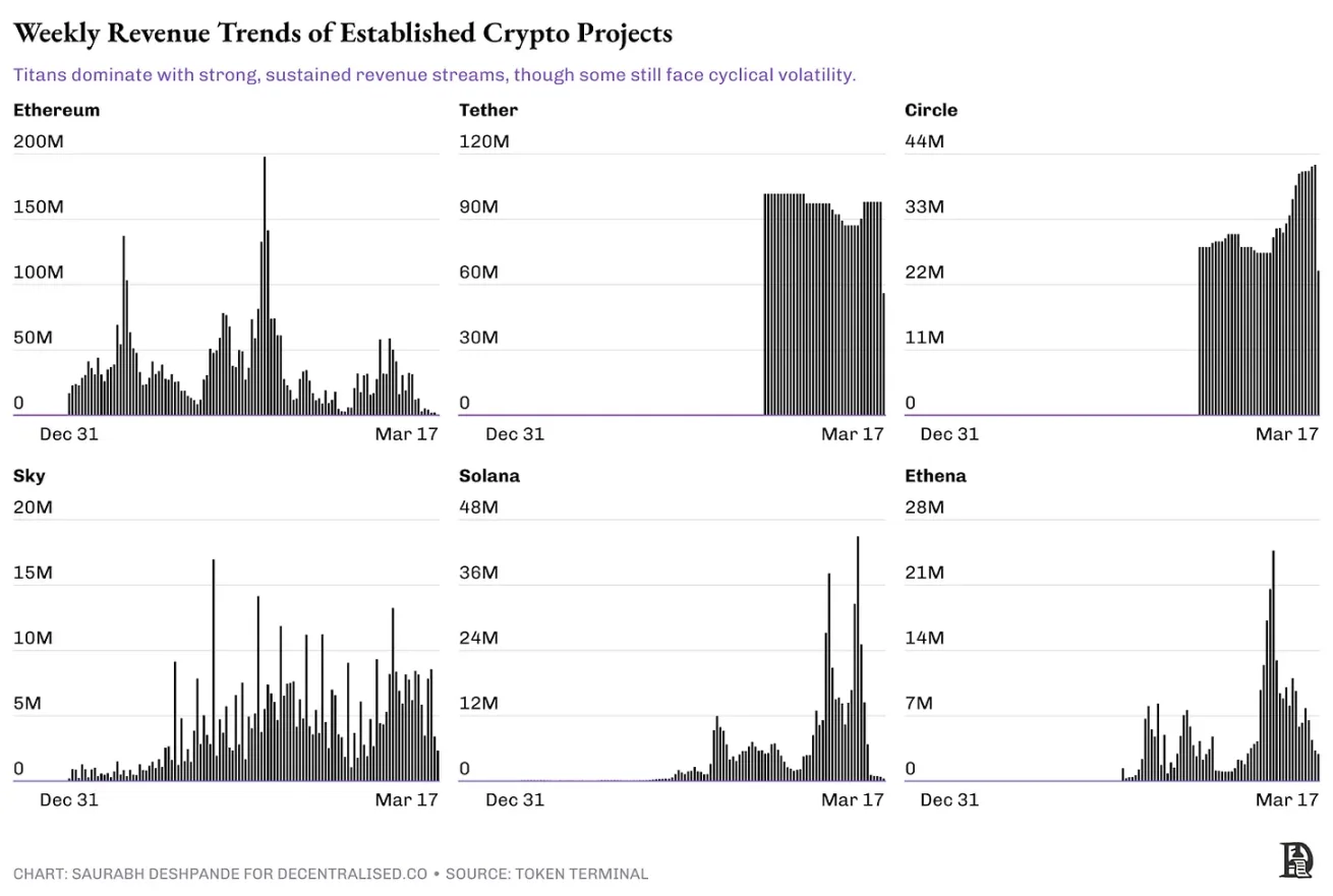 以太坊在去中心化收入生成方面處於領先地位,呈現出與網路高活動期相符的週期性高峰。Tether 和 Circle 這兩大穩定幣巨頭的營收情況則有所不同,收入流更穩定、更結構化,而非大幅波動。Solana 和 Ethena 雖然營收可觀,但仍存在明顯的增長與回落週期,反應出它們不斷變化的採用狀況。