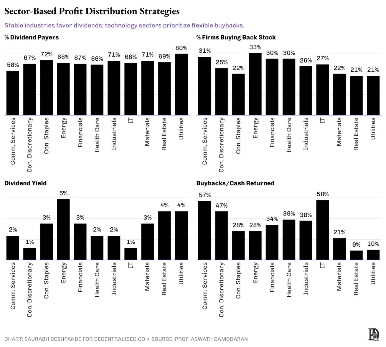 公司年齡與利潤分享策略之間的關係自然延伸到特定行業的實踐中。雖然年輕公司通常優先考慮再投資,但成熟公司會根據所處行業的特點調整策略。現金流穩定、豐富的行業傾向於可預測的股息,而以創新和波動為特徵的行業則更喜歡股票回購帶來的靈活性。理解這些細微差別有助於加密專案創辦人有效調整收入分配策略,使專案的生命週期階段和行業特點與投資者期望相匹配。