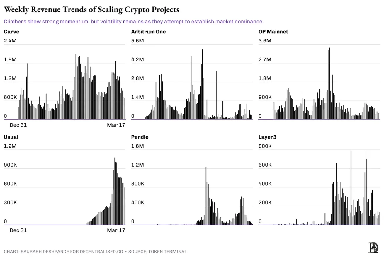 像 Curve 和 Arbitrum One 等專案,營收流較為穩定,有明顯的高峰和低谷,這表明受市場週期和激勵措施影響而出現波動。OP Mainnet 也呈現類似趨勢,激增表明需求旺盛期,隨後就會放緩。與此同時,Usual 的營收呈指數級增長,這表明其被迅速採用,但缺乏歷史資料來確認這種增長是否可持續。Pendle 和 Layer3 的活躍度出現大幅飆升,表明當前是使用者參與度較高的時刻,但也揭示了長期保持發展勢頭的挑戰。