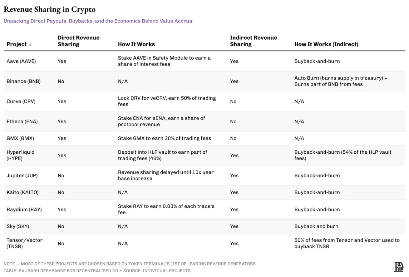 除了這些與代幣整合的策略,一些專案採用更直接的收益分享方法,讓人聯想到傳統的公開股權實踐。然而,即使是直接收益分享模式,也必須謹慎操作,以避免被歸類為證券,在獎勵代幣持有者與遵守監管規定之間保持平衡。像 Hyperliquid 這樣在美國境外的專案,在採用收益分享做法時往往有更大的操作空間。