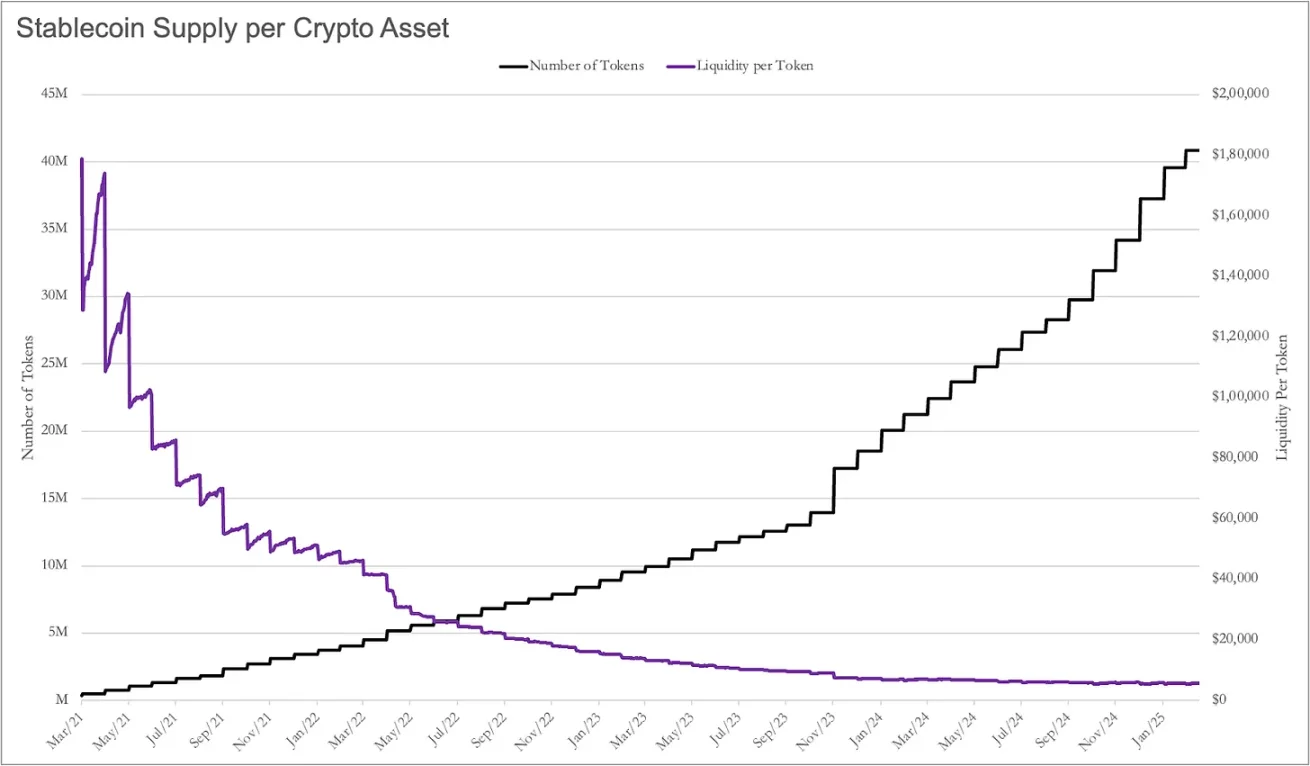 2021 年 3 月,每個加密貨幣約能享受到價值 180 萬美元的穩定幣流動性,而到了 2025 年 3 月,這一數位僅為 5500 美元。