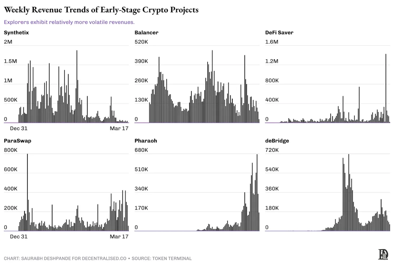 這些專案仍在尋找產品與市場的契合點,營收模式凸顯了它們難以維持持續增長的困境。像 Synthetix 和 Balancer 等專案,營收呈現大幅飆升後又顯著下滑的態勢,這表明它們存在投機活動期,而非穩步被市場接納。