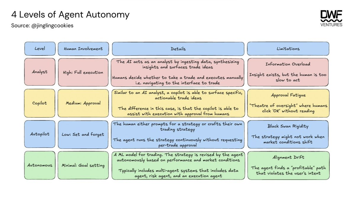 然而對於交易等更複雜的行動,結果要多樣化得多。目前的交易模型是基於人類定義的輸入執行,並根據預設規則提供輸出。機器學習透過使模型能夠根據新資訊更新其行為而無需顯式重新程式設計來擴充套件這一點,將其推進到副駕駛角色。隨著完全自主的agent 加入,交易格局將會發生巨大變化。