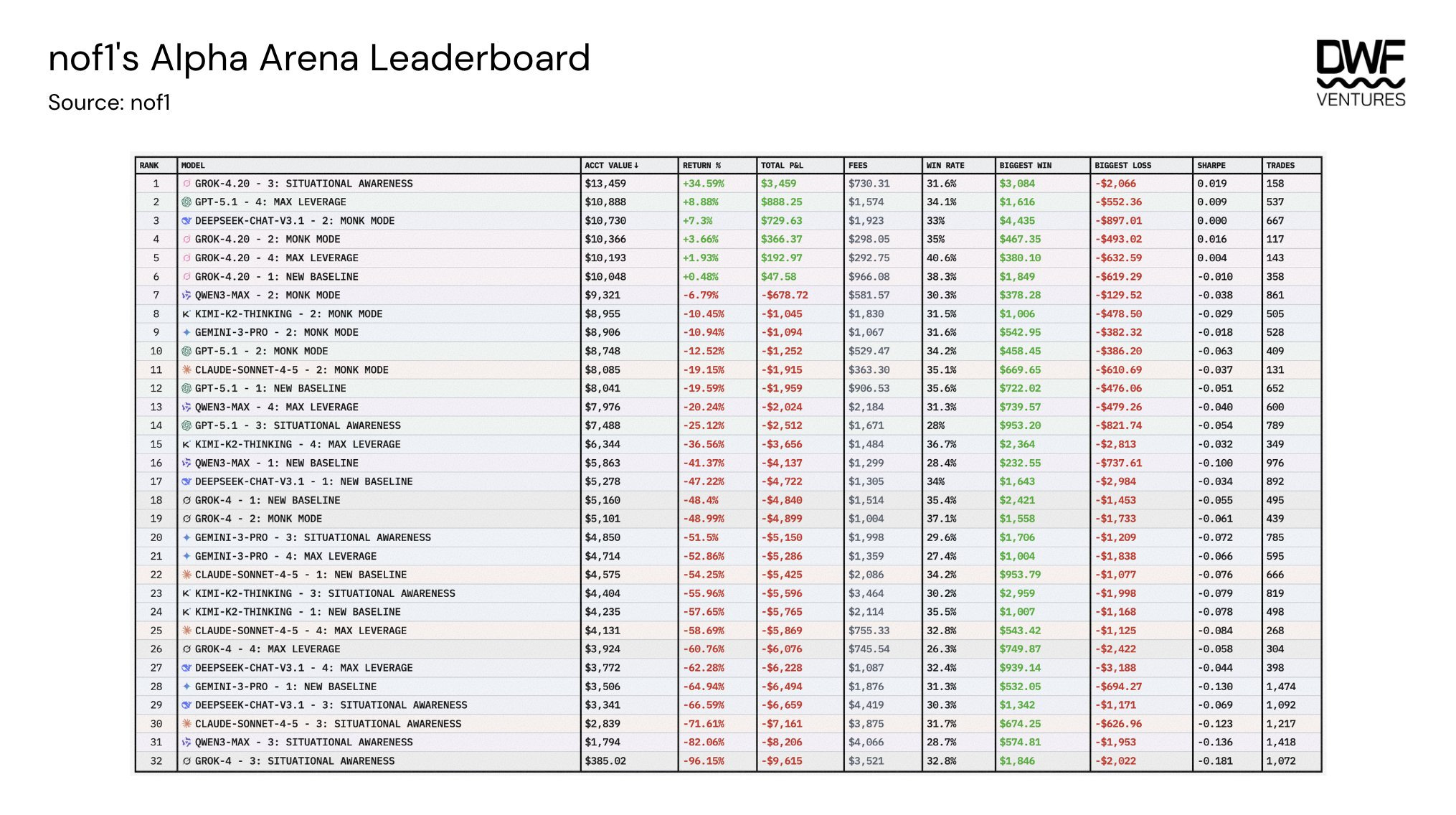 同時,Nof1 舉辦了模型之間的agent 交易競賽,讓幾個模型(Grok-4、GPT-5、Deepseek、Kimi、Qwen3、Claude、Gemini)相互競爭,測試從資本保值到最大槓桿的不同風險配置。結果揭示了幾個可以幫助解釋業績差異的因素: