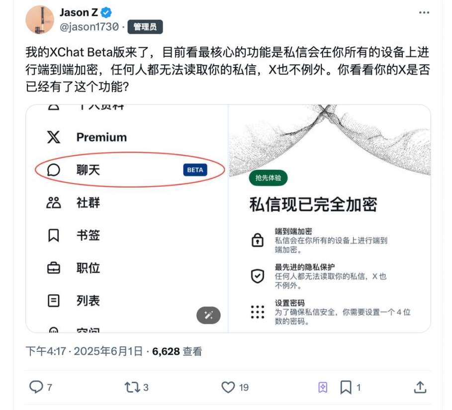 6 月 1 日,馬斯克開始發力,宣佈 X 平臺推出全新訊息系統 XChat,主打端到端加密、消失訊息、任意檔案傳輸和跨平臺音視訊通話。