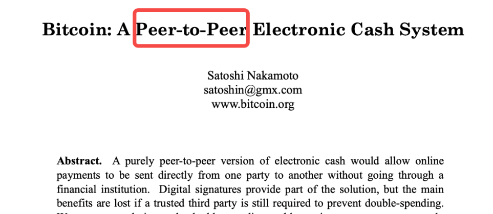 其實十多年前的比特幣白皮書標題已經說的很清楚了,「點對點的現金支付系統」,這裡的點對點也即經常聽到的 P2P。