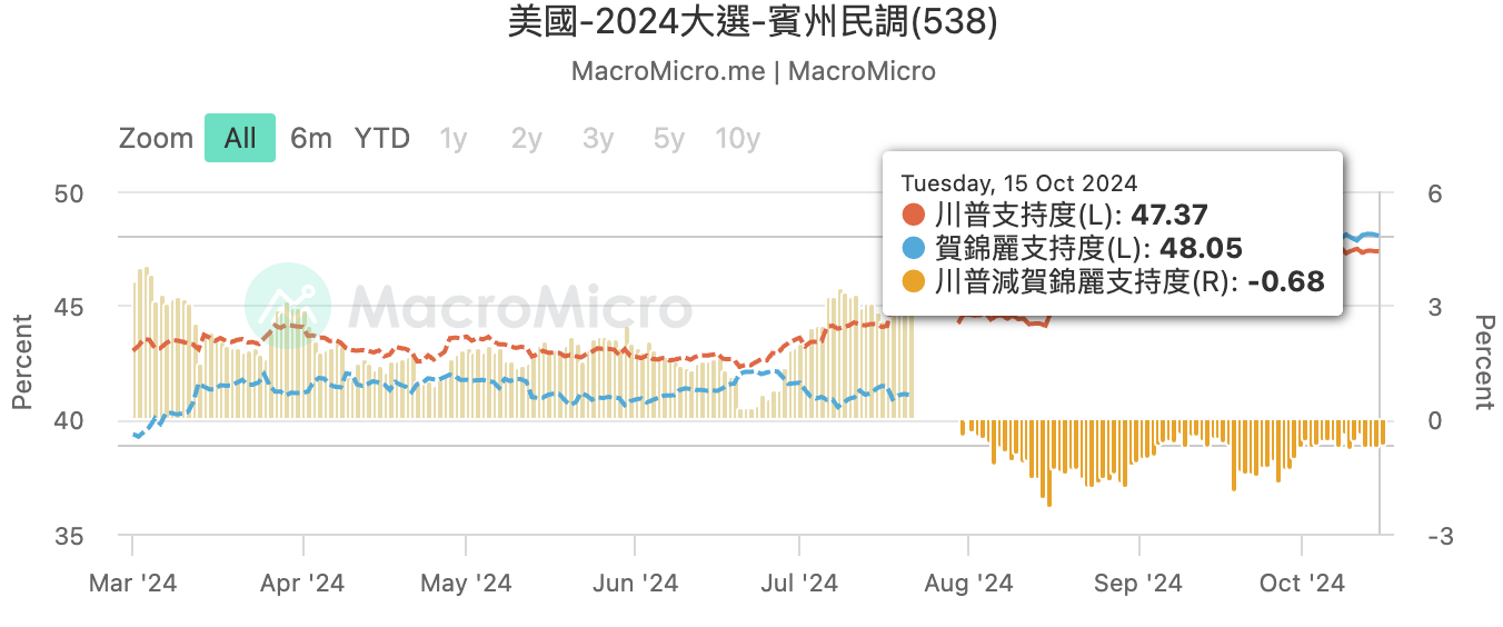 另一方面,根據 MacroMicro 最新資料顯示,川普目前在搖擺州賓州(Pennsylvania)的支持度為 47.37% 略低於賀錦麗的 48.05%。