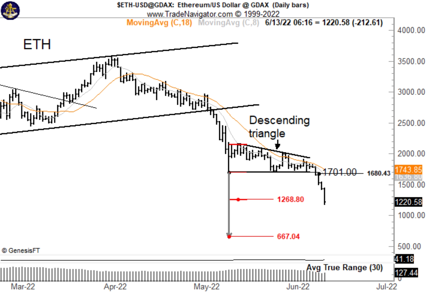 不過傳奇交易員、The Factor LLC 執行長 Peter Brandt 在推特上分享自己的分析圖表指出,以太坊的跌勢恐怕還沒有結束,指以太坊出現了下降三角形的看跌形態,在到達下跌第一目標 1268.8 美元後,接下來恐跌至 667.04 美元。
