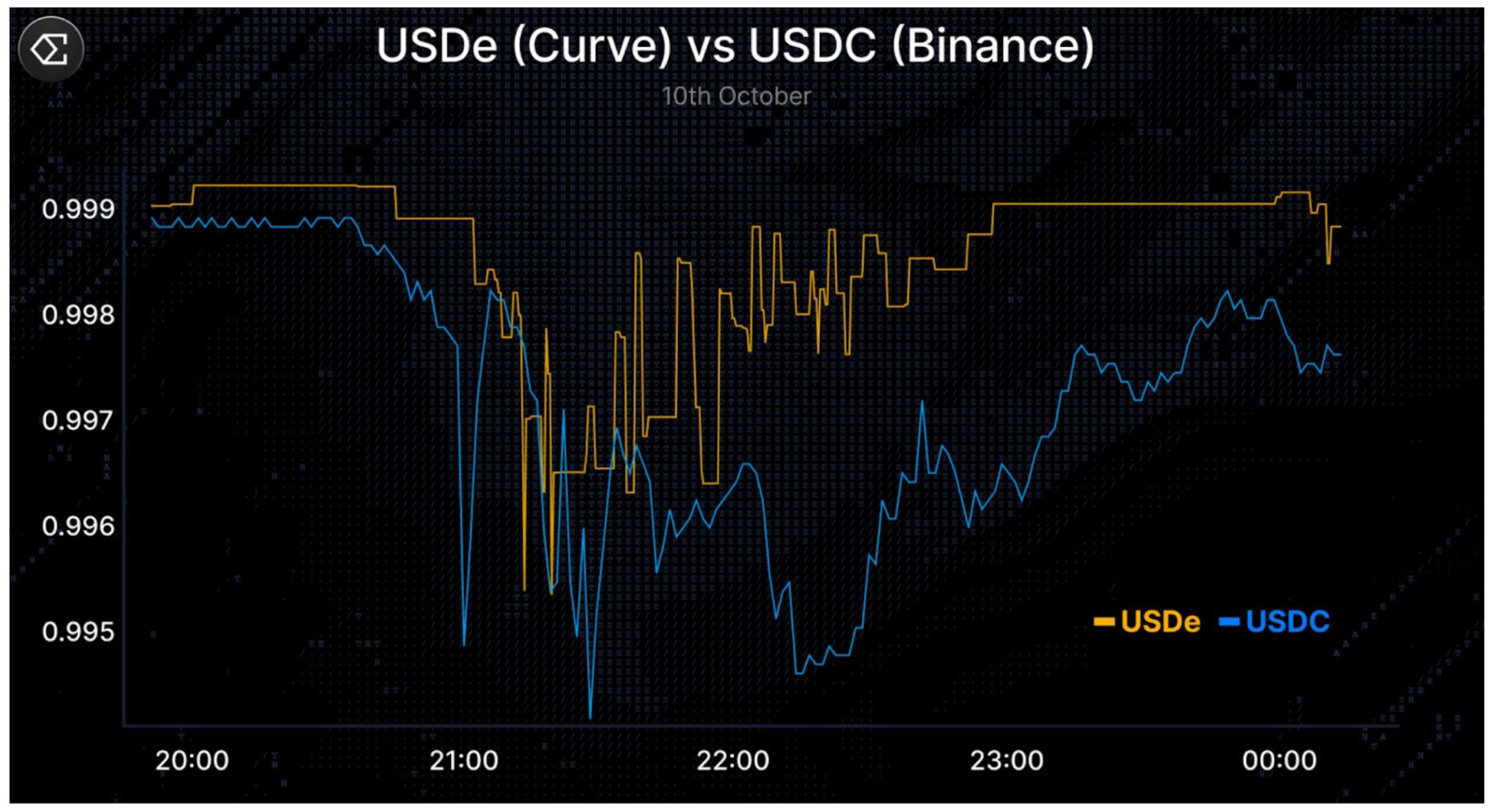 2025 年 10 月 10 日,加密市場出現極端去槓桿事件;短短數小時內,約 200 億美元的部位遭到清算,主要 CEX 與 DEX 的未平倉部位全面崩落。在連環發生的清算中,USDe 在幣安一度跌至約 0.65 美元,源於幣安的「預言機設計」而招致批評。然而,在鏈上更具流動性的場域如 Curve,USDe維持接近平價(見下方圖),贖回也持續正常——顯示這是一個特定場域的錯位,而非系統性脫鉤。關於 10 月 10 日事件,Guy 在 X 上的這串貼文相當值得一讀。