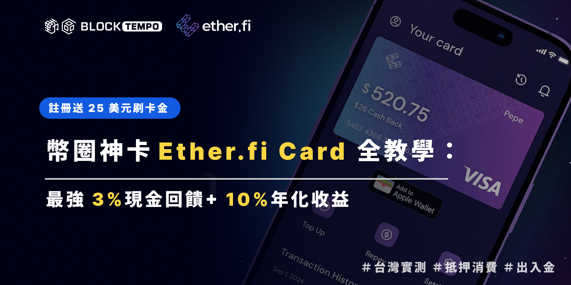 Ether.fi Cash Card 可說是目前幣圈最受歡迎的原生 DeFi 加密信用卡,它打破「消費或理財只能擇一」的邏輯,把錢包連結消費、借貸與收益,每筆交易享有 3% 現金回饋,同時你的資產還可在鏈上產生年化約 10% 收益。沒有年費、無需質押、5 分鐘即可開卡,讓加密輕鬆融入生活。( 現在使用動區獨家推薦連結,即享「25 美元刷卡金+3% 現金回饋」 )