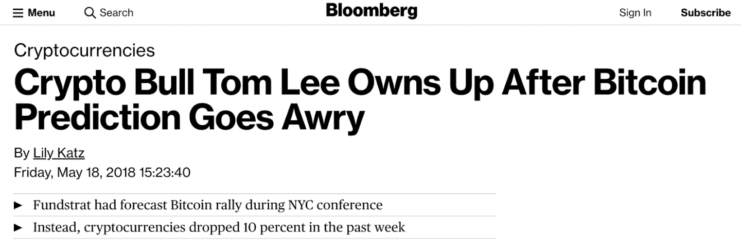他首次公開預測加密貨幣的價格是在 2017 年年中。當時比特幣價格在上半年翻了一倍多,達到 2,500 美元,這促使 Tom Lee 在截至 2018 年 5 月的 10 個月內,至少對比特幣的未來價格進行了 10 次預測。