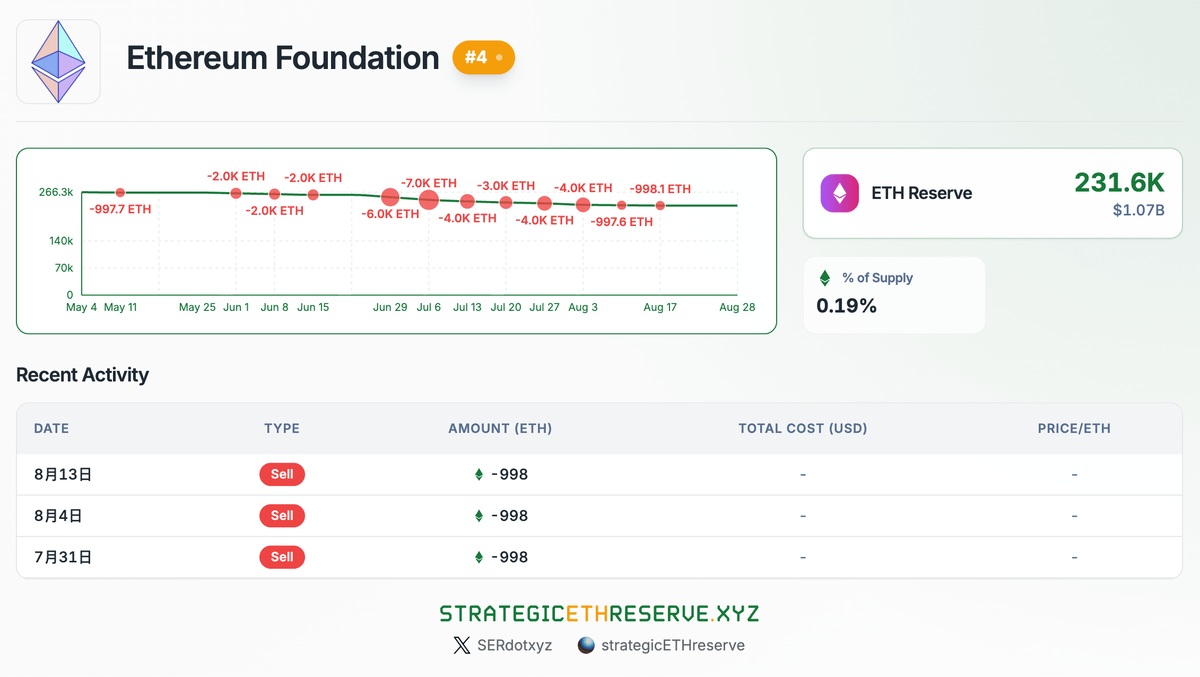 目前,以太坊基金會持有約 23.16 萬枚 ETH,占總供給約 0.19%。雖然規模不算龐大,但這部分資金是長期策略性儲備。基金會一般會定期拋售少量 ETH,用來支持研發、社群撥款與營運,基本上屬於「健康的賣壓」。