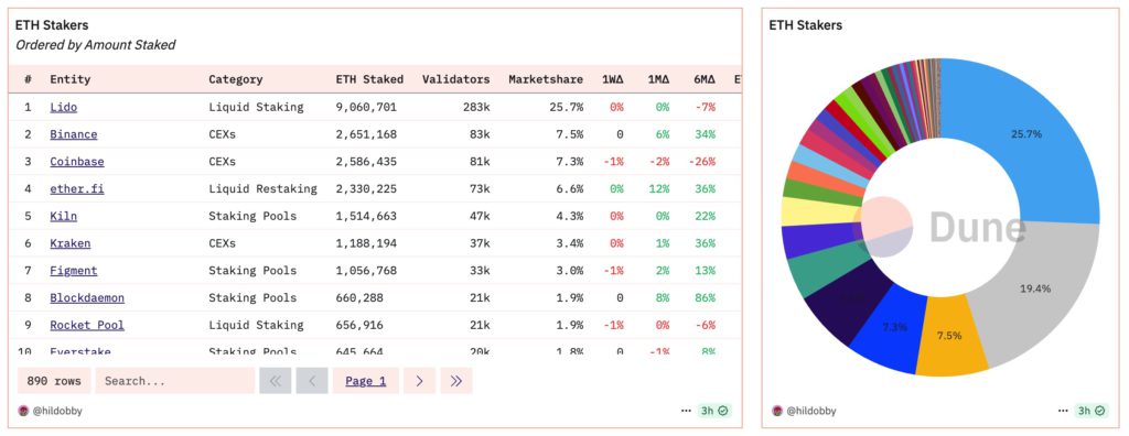 不過流動性質押協議 Lido 目前控制約四分之一質押量,Coinbase 與幣安又各占 7.5%…,雖然方便用戶參與以太坊網路,但過度集中化的問題也是長期以來尚未解決的隱憂。