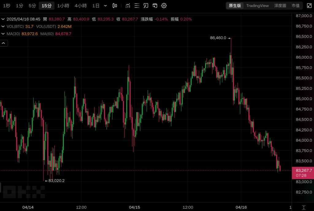加密貨幣市場方面,比特幣昨晚一度來到 86,460 美元之後,賣壓開始湧現,截稿前現報 83,267 美元,近 24 小時下跌超 2%。以太坊現報 1586.7 美元,近 24 小時下跌 2.75 %。