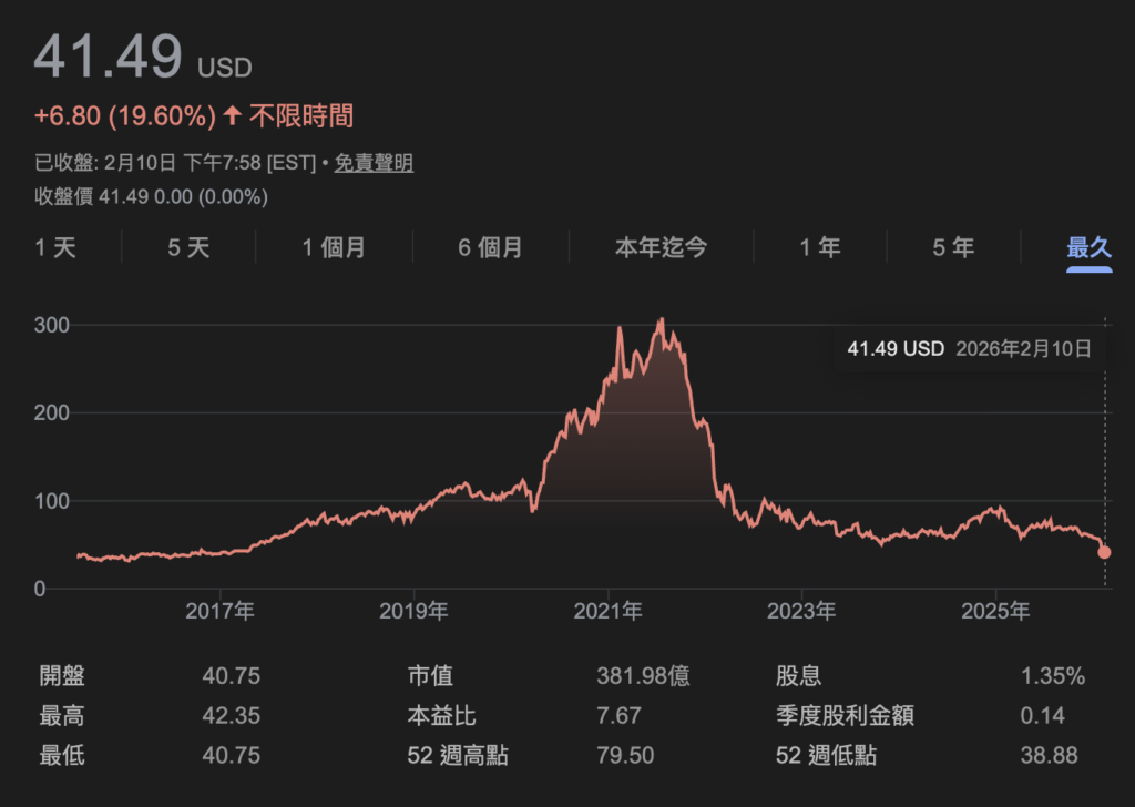 41.49 美元,這是 PayPal 在 10 日的收盤價。相比五年前 307 美元的歷史高點,這家公司的市值蒸發了超過 86%,從 3,600 億美元跌至不到 400 億美元。