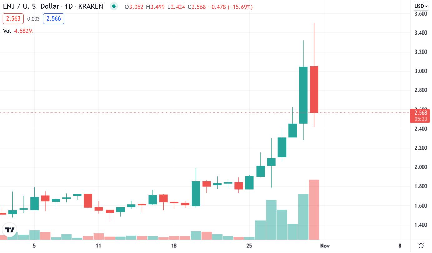 ENJ 從 25 日便呈現連番漲勢,Meta 改名隔日漲幅更再度加大,最終於 31 日創下歷史新高 3.499 美元,單周漲幅達 182.2%。