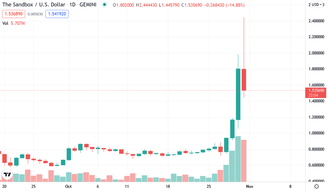 SAND 自 28 日起便連長四天,在 31 日創下其歷史新高 2.44443 美元,四日內漲幅高達 277.27%,至截稿前則回落在 1.56 美元左右。