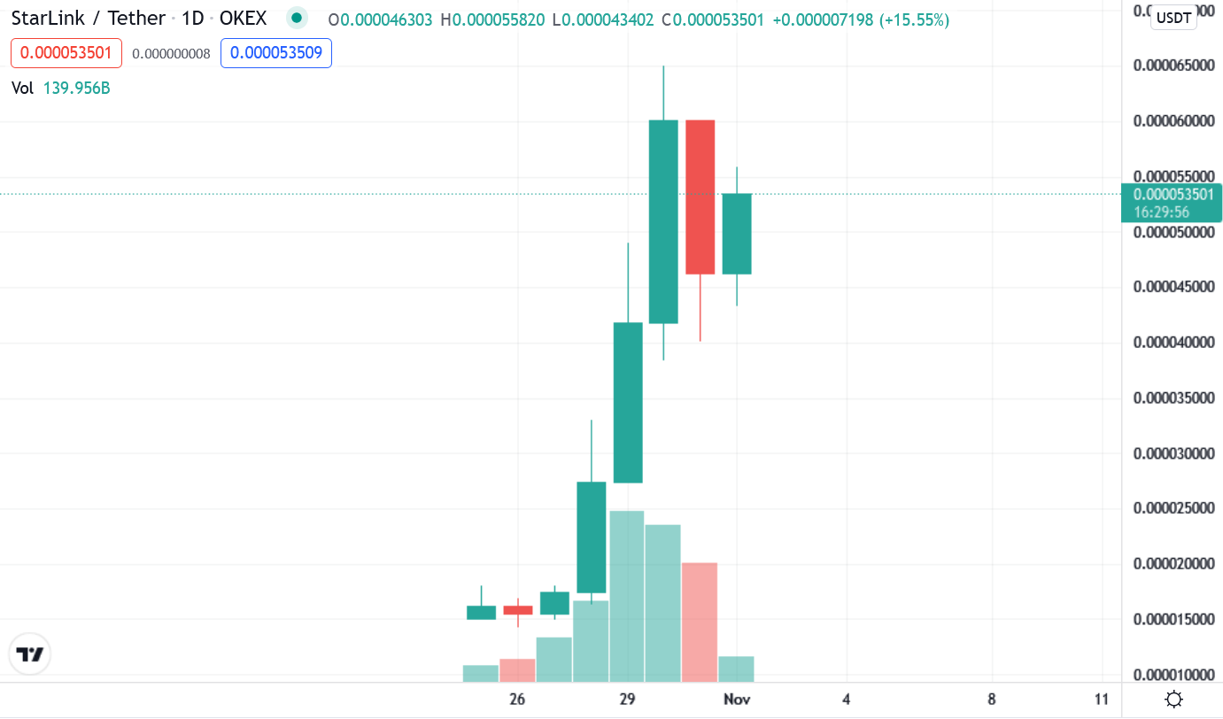 STARL 早一步在 28 日便展開暴漲之旅,一路衝到 30 日的 0.000065 美元,72 小時內漲幅達 361%。至截稿前 STARL 小收在 0.000053501 美元。